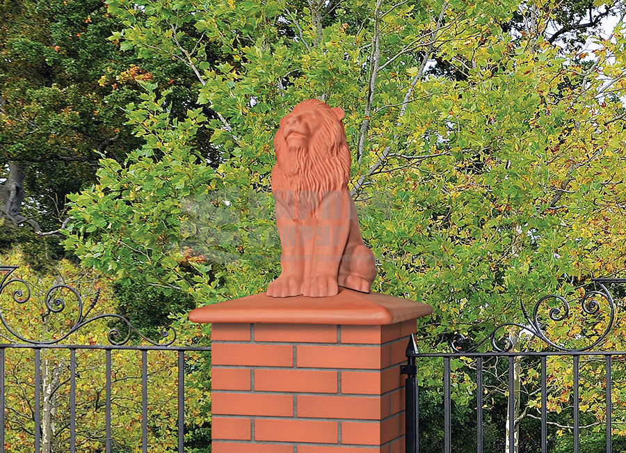 Клинкерный колпак (оголовок) для забора "Рубиновый красный" - LION производства King Klinker, находящегося в Польше, имеет размер 445x445x520 мм в виде льва. Применятся для ограждений, заборов, а также их столбов.